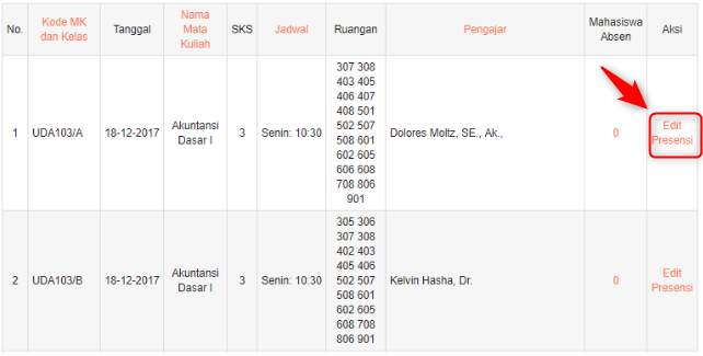 Setelah itu klik edit presensi pada mata kuliah yang akan diisi kehadiran mahasiswanya