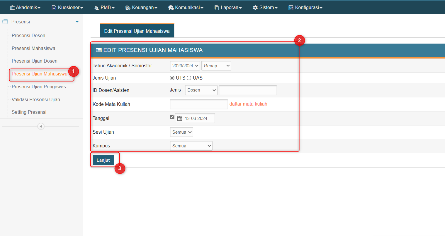 Cara untuk edit presensi ujian mahasiswa yaitu dengan cara mengakses menu akademik > presensi kuliah > presensi ujian mahasiswa > edit presensi ujian mahasiswa > Tentukan Tahun Akademik Semester, Pilih jenis ujian (UTS/UAS), Tentukan ID Dosen, kosongkan untuk memilih semua dosen, Kode mata kuliah, kosongkan jika akan menampilkan semua, Tanggal, sesi jam > lanjut