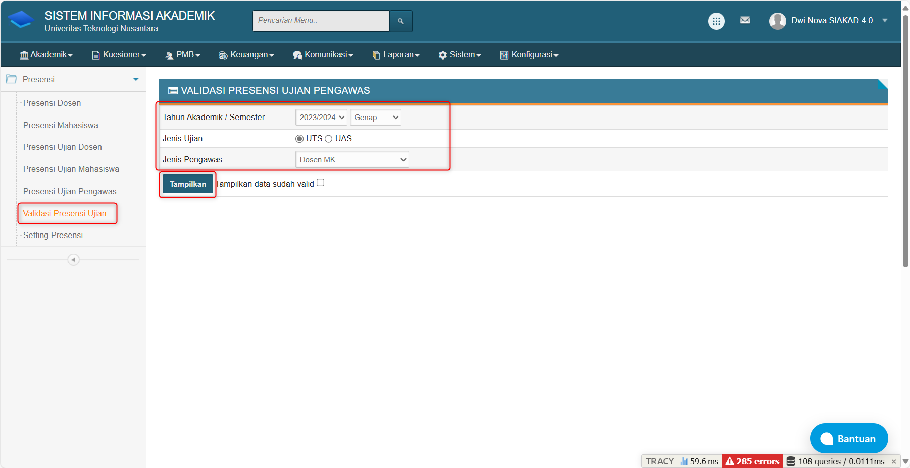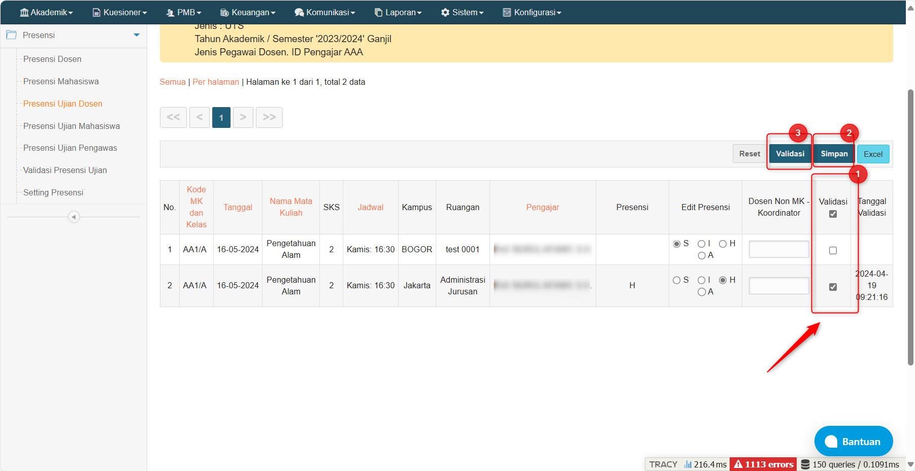 jika sudah, cari mata kuliah yang akan divalidasi kan presensi pengawasnya > klik edit > ceklis pada menu validasi > simpan > validasi