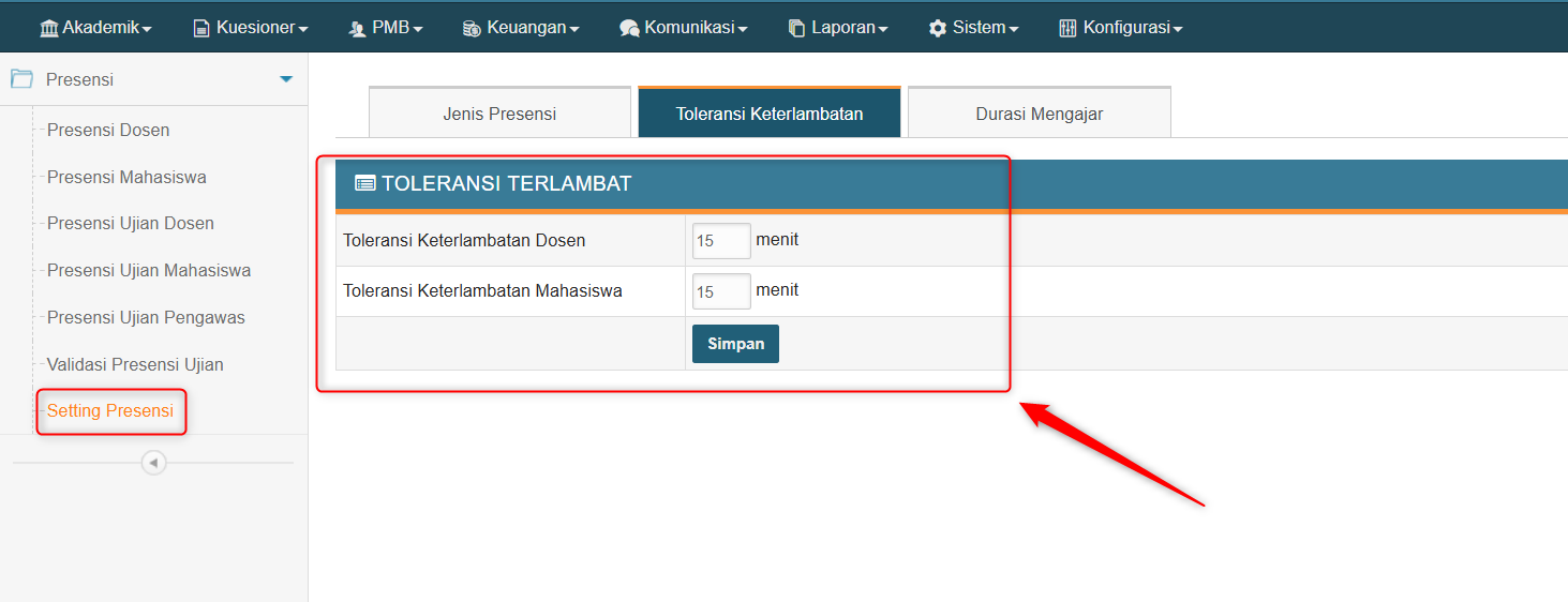 Cara untuk setting toleransi keterlamabatan presensi ini yaitu dengan cara mengakses menu akademik > presensi kuliah > setting presensi > toleransi keterlambatan > inputkan toleransi keterlambatan dosen dan mahasiswa > simpan