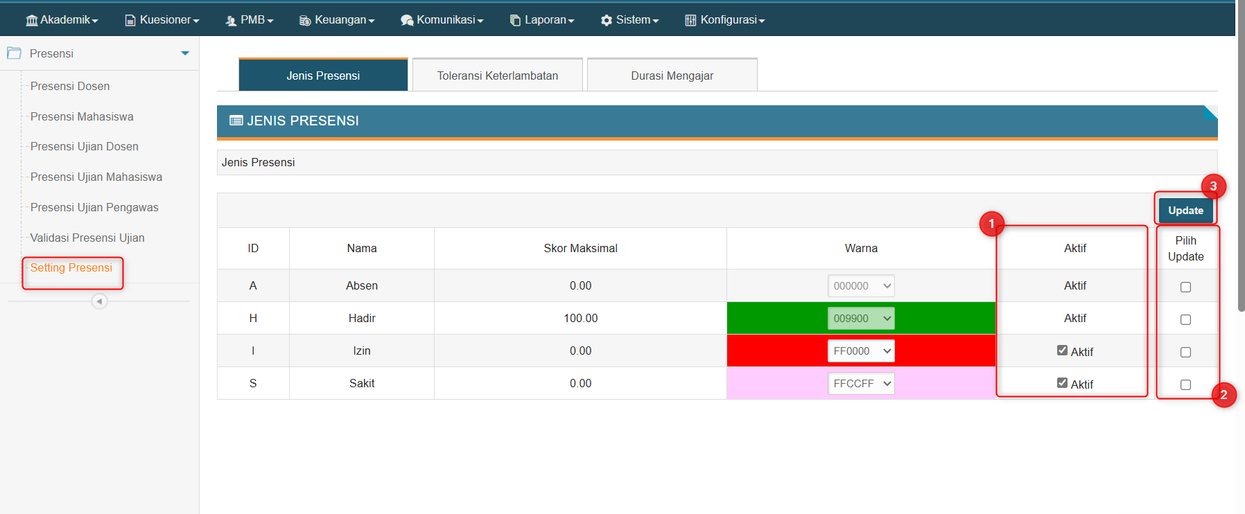 Jika kampus ingin menggunakan semua jenis presensi maka aktifkan semua jenis presensinya, tetapi jika ada beberapa yang tidak ingin digunakan misalnya sakit dan izin tidak ingin digunakan ➝ maka non aktifkan jenis presensi tersebut dengan cara unceklis aktif > ceklis kolom kotak > update