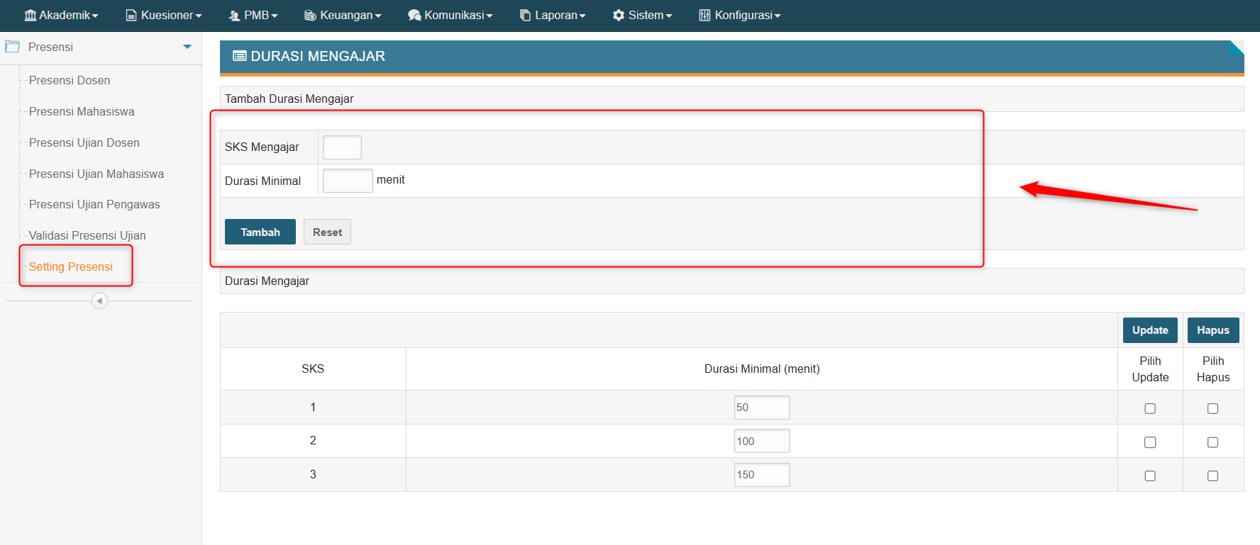 Cara untuk setting durasi mengajar yaitu dengan cara mengakses menu akademik > presensi kuliah > setting presensi > durasi mengajar > inputkan sks menagjar dan surasi minimal (menit) > tambah