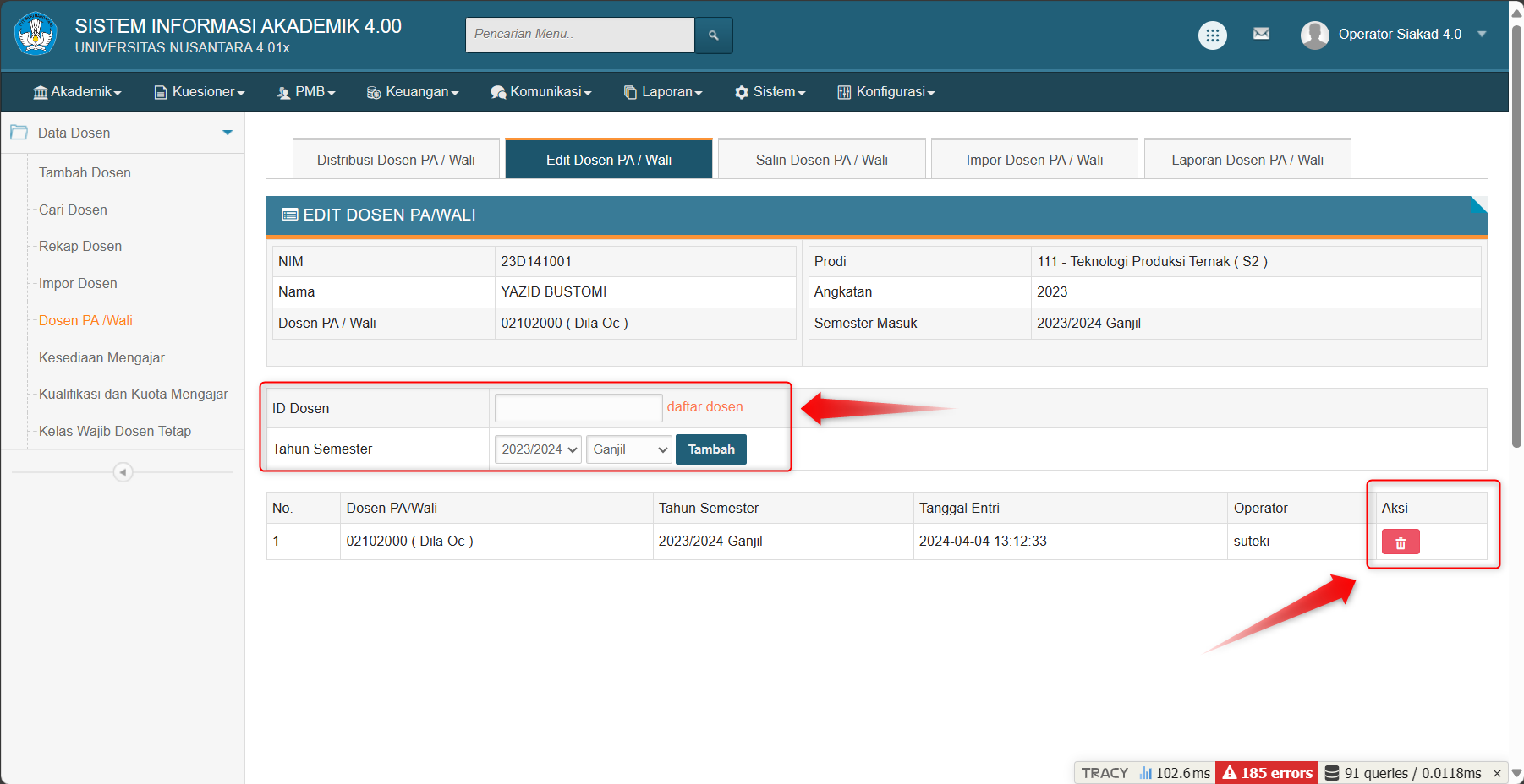 Jika salah menginputkan dosen wali pada mahasiswa, dapat melakukan edit/merubah dosen wali dengan cara mengakses menu Edit Dosen PA/Wali > Masukkan NIM mahasiswa > pilih menu pensil > hapus data Dosen PA/Wali yang sebelumnya > inputkan ID atau nama dosen
