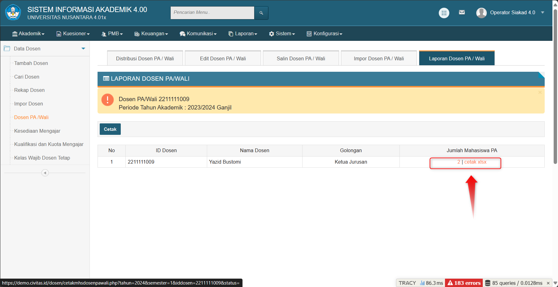 Cara untuk mengetahui jumlah mahasiswa bimbingan setiap Dosen PA/Wali dapat melalui menu Laporan Dosen PA/Wali > masukan ID dosen tersebut > tampilkan > klik angka jika ingin melihat jumlah mahasiswa > klik cetak xlsx jika ingin mendownload dalam bentuk file xlsx