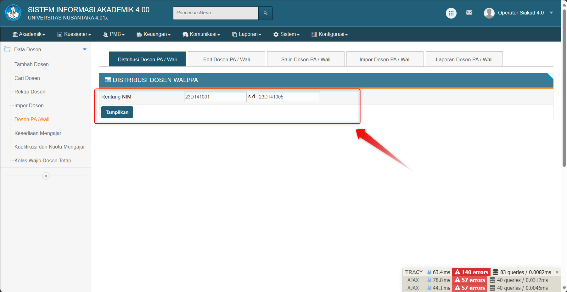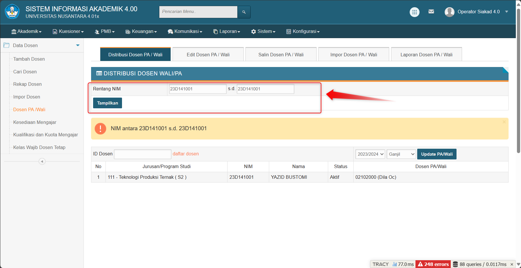 Jika hanya ingin mendistribusikan dosen PA/Wali pada salah satu mahsiswa saja, maka inputkan ke dua rentang NIM tersebut dengan NIM yang sama