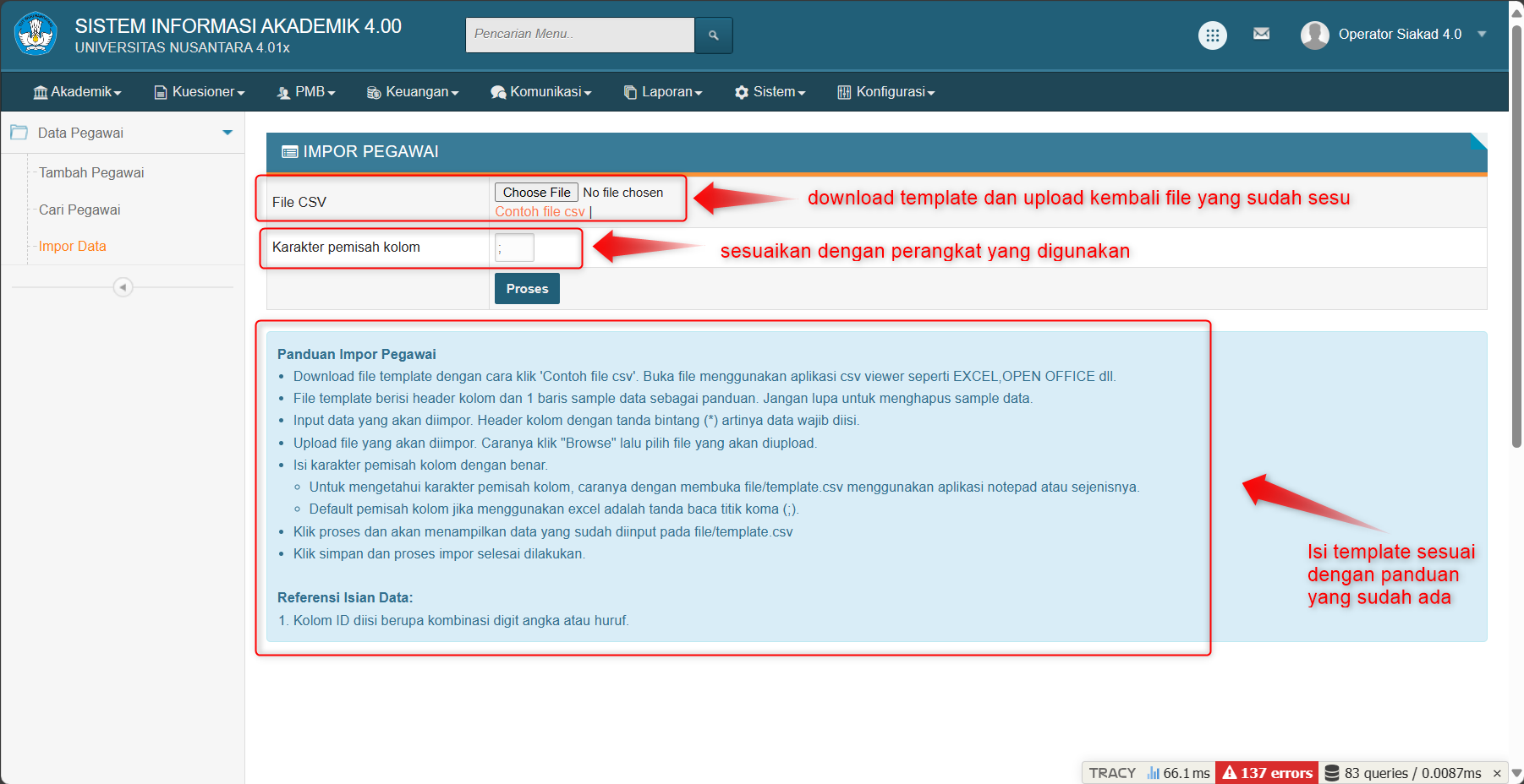 menu impor pegawai ini digunakan untuk menambahkan data pegawai secara massal di siakad, jadi tidak menambahkan data pegawai secara satu persatu