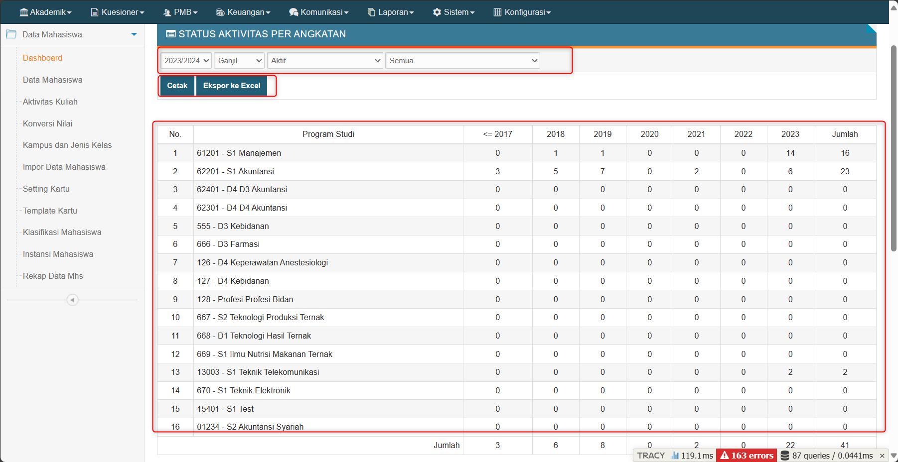 Menu status aktivitas digunakan untuk melihat data mahasiswa sesuai dengan periode nya. pada menu ini dapat menampilkan informasi jumlah mahasiswa yang aktif, cuti, non-aktif, double degree, kampus merdeka, menunggu uji kompetensi maupun mahasiswa yang belum memiliki status di setiap prodinya. Jika memerlukan laporan data status aktivitas mahasiswa juga dapat dilakukan cetak dan eksport ke excel denngan mengakses menu akademik > mahasiswa > dashboard > status aktivitas > pilih periode > pilih cetak atau eksport ke excel