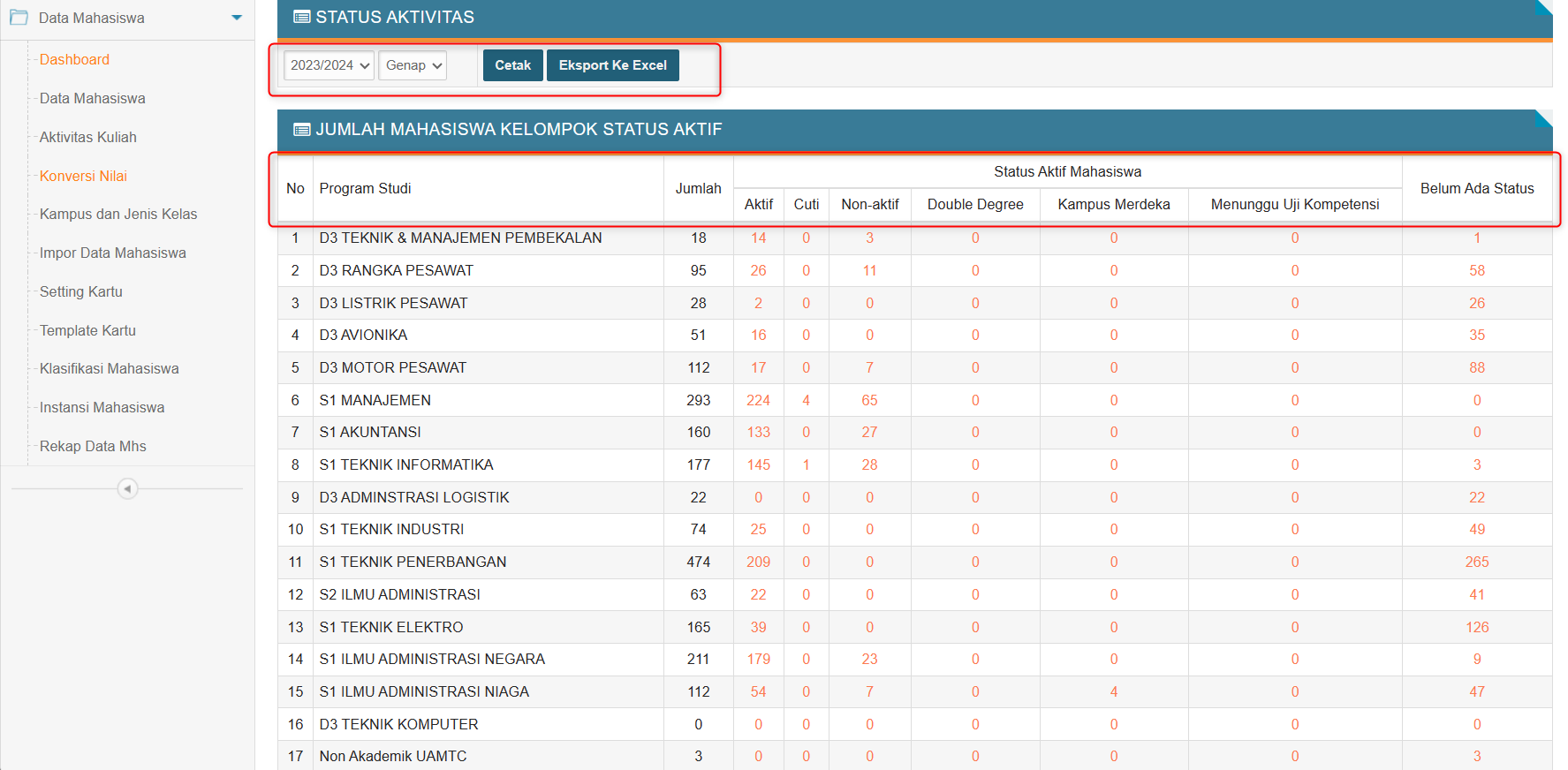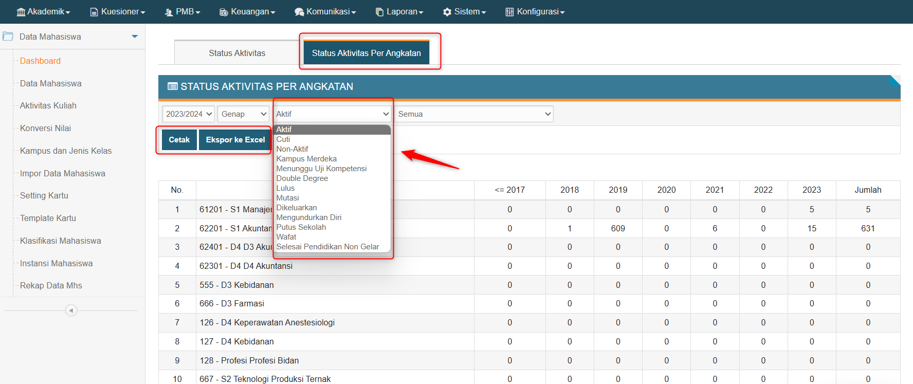 Jika kampus membutuhkan data tersebut untuk di cetak atau ekspor ke Excel silahkan dapat dilakukan dengan mengklik menu cetak atau ekspor ke excel sesuai dengan data yang dibutuhkan oleh kampus