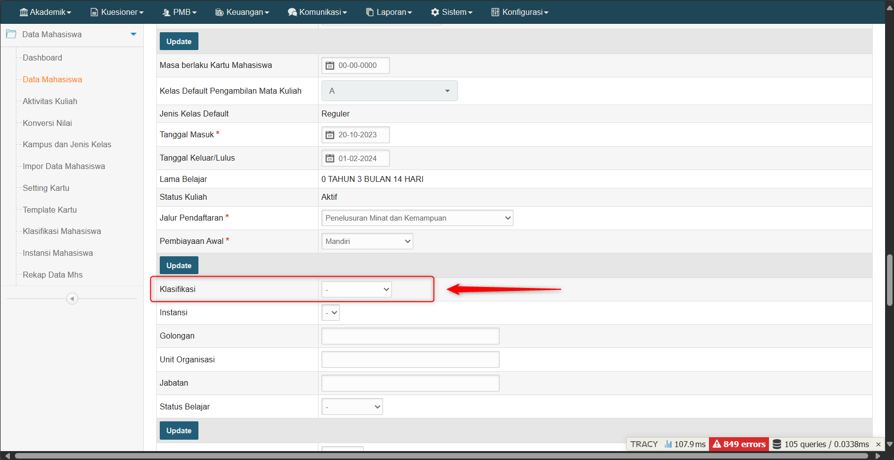 Bagaimana cara update klasifikasi mahasiswa pada data mahasiswa