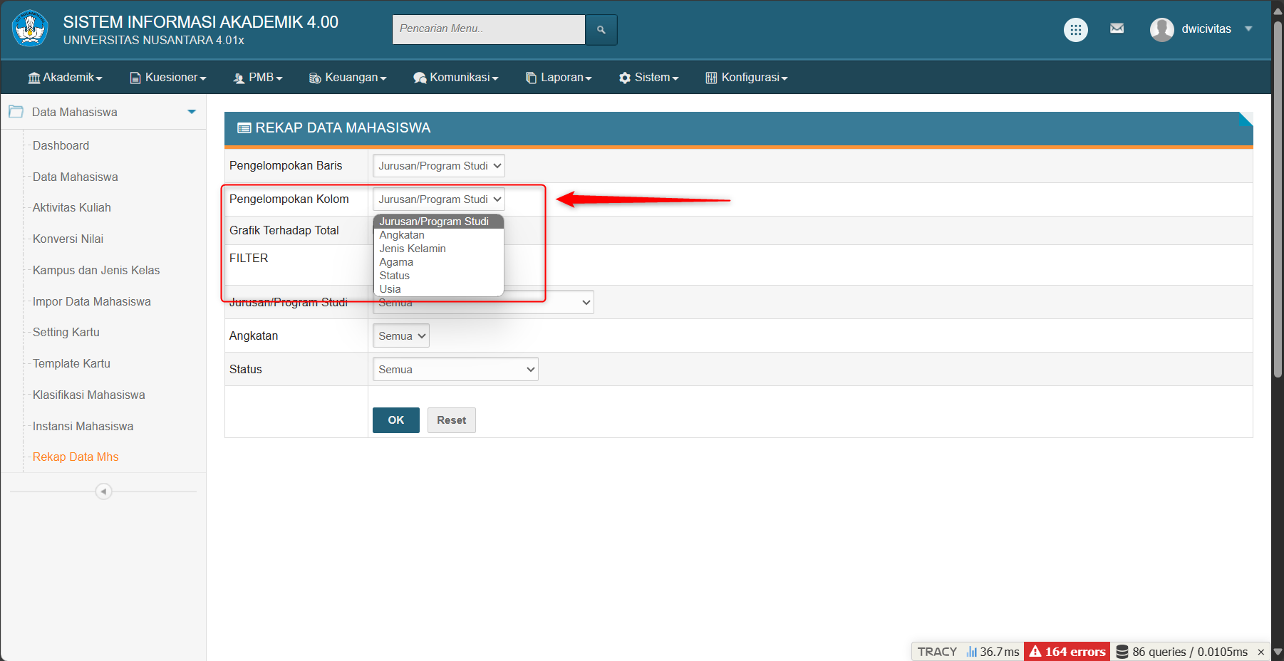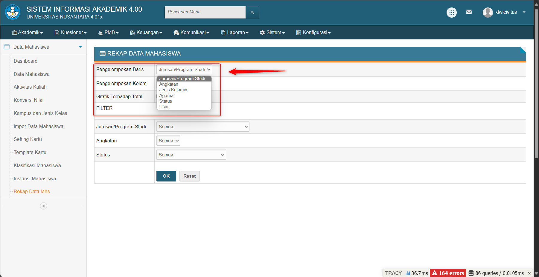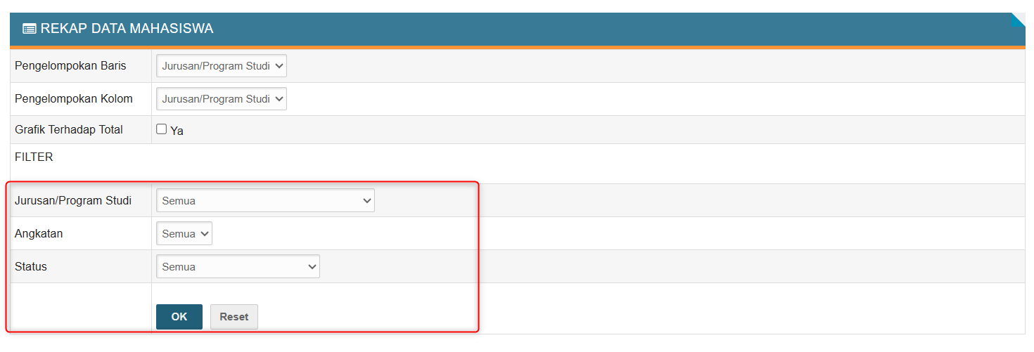 untuk melihat rekap data mahasiswa dapat mengakses menu akademik > mahasiswa > rekap data mahasiswa> pilih filter pengelompokan baris yang akan ditampilkan seperti gambar dibawah ini: